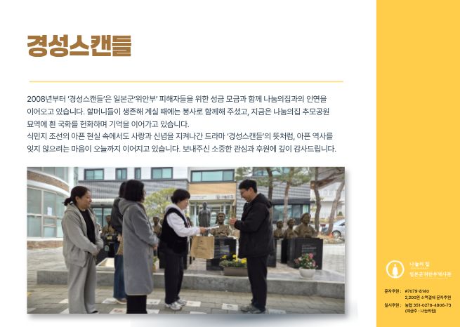 2008년부터 ‘경성스캔들’은 일본군‘위안부’ 피해자들을 기억하며 성금 모금 활동을 이어오고 있습니다.